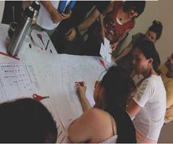 El Taller de mapeo colectivo en la Noite Branca (véase Imagen 1) se llevó a cabo en Belo Horizonte (Brasil) en 2012 y tuvo una duración de cuatro días. En él trabajamos en dos grandes mesas un mapa de Belo Horizonte dividido en dos partes. Con planchas de pictogramas les pedimos a los participantes que señalicen en el mapa la información que tuvieran sobre estos temas. El trabajo comenzó de forma tímida pero a media mañana ya estaban sumamente concentrados no sólo en compartir la información, sino en verificarla y profundizar sobre ella consultando en la web acerca de datos concretos. Nuevos íconos fueron creados, y se generó un mapa sumamente prolijo y completo referido a las temáticas más inquietantes (Iconoclasistas, s.f ).
