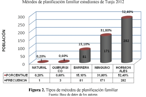 De 538 mujeres incluidas en el estudio, 282 estudiantes (52.4%), emplean procesos de planificación hormonales; 171 estudiantes (31,8%) no acceden a métodos anticonceptivos; 81 estudiantes (15.1%) utilizan métodos de barrera; 3 estudiantes han optado por esterilización quirúrgica y 1 estudiante prefiere usar métodos naturales (Gráfico 2).