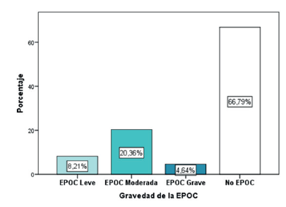 De los pacientes con diagnóstico de EPOC, el 20,3 % [15,7-25,4] presentan EPOC moderado, seguido del 8,2 % [5,0-11,8] que presentan EPOC leve; el 66,7 % [61,1-72,1] corresponde a los pacientes estudiados que reportaron alteraciones restrictivas o ninguna restricción y que, por tanto, no tienen el diagnóstico de EPOC.