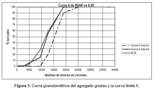 De todas las curvas confeccionadas, se optó por la correspondiente a la norma IRAM 1684, curva 6 de la figura 3, debido a que, por el tipo de agregado, las otras no encuadraban.