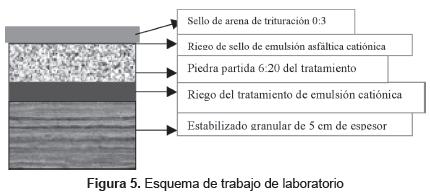 Colocado el estabilizado granular con el contenido de humedad óptimo en el molde mencionado, se compacta con un martillo neumático de base cuadrada de 15 cm de lado. Luego de 24 horas en ambiente de laboratorio y tratando de simular las condiciones de obra, se pesa el molde más el estabilizado granular. Se procede con la aplicación del primer riego de emulsión el cual es a través de un dispersor presurizado fingiendo el regado de la barra distribuidora convencional de riego de obra. Por diferencia de pesos, se coloca la cantidad de emulsión estipulada por la dosificación. De inmediato se esparce el agregado grueso y se apisona con el compactador propuesto por el ensayo MoDOT T 72. Después se aplica el segundo riego de emulsión teniendo en cuenta lo especificado en la Sección D.III "Tratamientos Superficiales de Sellado" del Pliego de Especificaciones Técnicas Generales de la Dirección Nacional de Vialidad y a la curva granulométrica elegida para tal agregado fino. Seguido del riego se esparce el agregado de sellado, sin compactar.