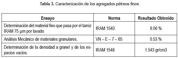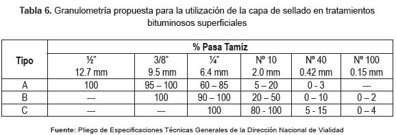 El agregado fino utilizado en la capa de sellado fue estudiado de acuerdo a lo estipulado en la sección D.III "Tratamiento bituminoso superficial de sellado" del Pliego de Especificaciones Técnicas Generales de la Dirección Nacional de Vialidad y la sección 409 del MoDOT. Los resultados de la caracterización física del mismo se dan en la Tabla 3.