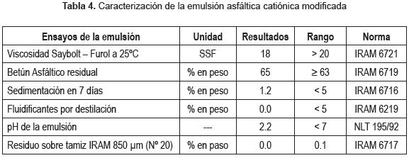 En el caso que la relación pasa tamiz N° 200 (Abertura IRAM 75 μm) vía seca y húmeda no cumpla con lo estipulado en el Pliego de de Especificaciones Técnicas Generales de la Dirección Nacional de Vialidad o existan condiciones climatológicas muy adversas para el corte de la emulsión (es decir muy ventoso y/o seco) la recomendación de la mayoría de la bibliografía consultada y los Pliegos de Especificaciones, es la utilización de emulsión de corte medio. Según lo expuesto y de acuerdo con la caracterización del fabricante de la emulsión, se adjunta en la Tabla 4 los resultados de los ensayos.