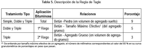 La regla de Tagle determina la cantidad de ligante en los tratamientos simples, dobles y triples, en función de las cantidades y características granulométricas de los agregados pétreos. Las premisas que se deben tener en cuenta son: no se contempla la dosificación de sellado y retratamientos; la base es suficientemente estable y sin exceso de material bituminoso imprimado; los agregados pétreos son de una cubicidad aceptable; la cantidad de agregado pétreo en los tratamientos tipo simple no excede en más de un 20 % de la necesaria para cubrir la superficie a tratar; sobre los tratamientos tipo doble y triple se aplicará un riego de sellado a razón de 0.7 l/m2 de emulsión bituminosa. El método se basa en los siguientes lineamientos: