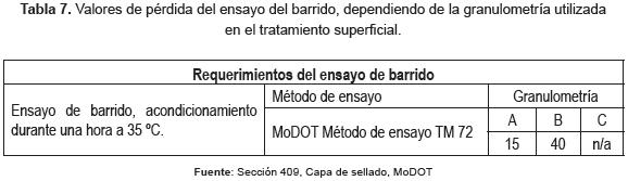 La sección 409, en sus apartados 409.1 y 409.2, describe las características que deben cumplir los materiales componentes de un tratamiento superficial. En el apartado 409.3 la fórmula de la mezcla de trabajo antes de la colocación de la capa de sellado. En particular nos centramos en el apartado 409.3.2 donde cita: ... el ensayo de barrido de tratamientos superficiales bituminosos deberán estar de acuerdo con los criterios expuestos en la Tabla 7 que fue utilizada para evaluar las pérdidas que sufren las pastillas de tratamiento superficial confeccionadas.