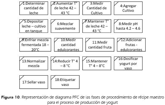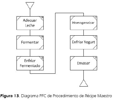Al tener los diagramas PFC de todos los procedimientos de unidad, se procede a realizar el diagrama PFC del procedimiento de récipe; en la Figura 13, se puede observar dicho diagrama. Una vez realizados todos los diagramas PFC desde las fases hasta el procedimiento de récipe, se concluye el procedimiento de modelado ISA S88. Se puede editar en herramientas software especializadas, la ejecución de órdenes de producción basadas en récipes. Con el desarrollo de los procedimientos propuestos, se determinan los modelos y la información de una manera adecuada, y se prepara así para la edición en herramientas software.