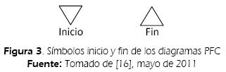 Símbolos para puntos de inicio y final. Los diagramas PFC deben tener por lo menos un símbolo de inicio para designar el comienzo de cada PFC, y por lo menos, un símbolo final para designar el final de cada diagrama PFC (Figura 3).