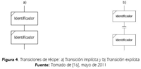 Transiciones explícitas: Ocurren cuando la conexión entre las entidades de récipe es directa y se representa con una única línea entre las entidades de récipe, la cual tiene dos barras cortas perpendiculares a la línea de enlace, (Figura 4 b). Esta transición está definida por una expresión que se evalúa como verdadera o falsa.