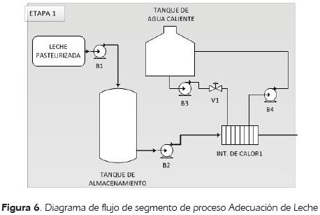 Diagrama de flujo de proceso: El diagrama de flujo de proceso, (Figura 6), es un esquema que permite conocer las características físicas del segmento Adecuación de Leche. En él, se debe ver el camino de transformaciones físicas y químicas a las cuales se ve sometida la leche pasteurizada en su proceso de adecuación [17].