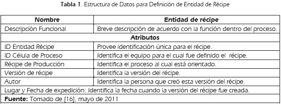 Después se define el modelo de datos del récipe maestro para el proceso de producción, que debe contener toda la información registrada en el modelo de récipe maestro, tal como se muestra en la Tabla 2.