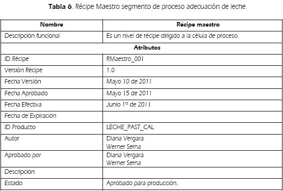 Récipe Maestro para segmento de proceso adecuación de leche. En la Tabla 6, se define el modelo de datos del récipe maestro para el segmento de proceso adecuación de leche.