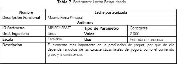 Parámetros de récipe de segmento de proceso adecuación de leche. Parámetros de Entradas del Proceso: Se refieren a los materiales, materias primas, y aditivos que se utilizan durante el proceso de fabricación. En la Tabla 7, se define la entrada de proceso leche pasteurizada.