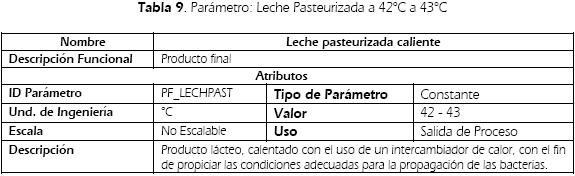 Parámetros Salidas de Proceso: Se refieren a los productos finales e intermedios que resultan durante y al final del proceso de fabricación. Para el caso del segmento de proceso, se tiene como salida de proceso: leche pasteurizada caliente, que se encuentra definido en la Tabla 9.