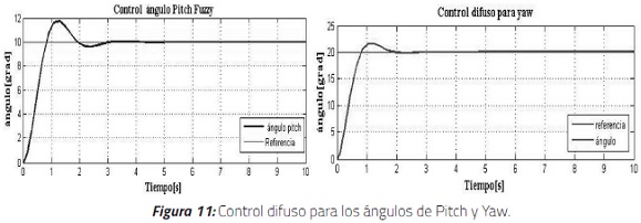 La Figura 14 muestra los resultados del control difuso para el ángulo pitch. Se observa que la salida del sistema converge a la referencia, logrando establecerse alrededor de 8 segundos. Para el ángulo de yaw, la respuesta tiene un comportamiento más sub-amortiguado, y mantiene tiempos casi similares a los del pitch en cuanto a la estabilización.