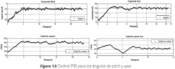 Las simulaciones de los reguladores PID de posición para el ángulo de pitch y yaw se desarrollaron mediante la herramienta de software MATLAB/Simulink. La Figura 10 ilustra los resultados obtenidos con los reguladores PID. En ella se observa que los reguladores responden apropiadamente, con tiempos de estabilización de 3 a 4 segundos. Los sobreimpulsos, aunque no son deseados, permiten llegar a una referencia deseada de manera rápida.