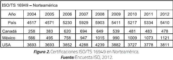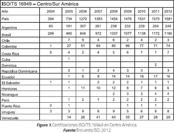 Para Rodríguez [8], Colombia cuenta con empresas tanto nacionales como extranjeras certificadas de acuerdo con los más altos estándares internacionales, como la norma ISO/TS 16949, que tienen experiencia en manejo de las tres tecnologías: americana, europea y asiática. Entre las empresas extranjeras se destacan Good Year, Michelin, Yazaki, Saint Gobain, Vitro, Dana, Dupont, entre otras. En el año 2012, Survey ISO presentó la encuesta sobre el número de empresas certificadas con el estándar internacional, en la que Colombia ocupa el cuarto puesto en Centro y Sur América con 74 certificaciones, respecto de 273 empresas ubicadas en la ciudad de Bogotá.