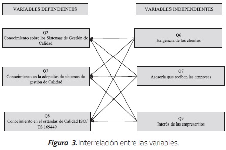 Se determina qué variables dependientes, como el conocimiento que tengan las empresas sobre los sistemas de gestión de calidad, conocimiento en la adopción de los SGC y el conocimiento en la adopción del sistema ISO/TS 16949, dependen de variables como la exigencia que realicen los clientes sobre los SGC, la asesoría que reciben las empresas en SGC y el interés de los empresarios en adoptar los SGC.