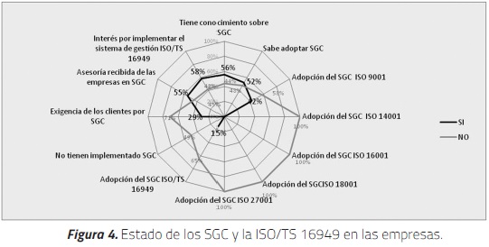 De los resultados obtenidos, 32 (49 %) empresas encuestadas de 65 (100 %) no cuentan con SGC porque no es una exigencia de los clientes. De estas empresas sólo 4 (6 %) cuentan con el conocimiento sobre los SGC. Por otra parte, 33 (51 %) empresas han implementado SGC, en especial la ISO9001 y 16 (25 %) no conocen el estándar ISO/TS 16949. A 16 (25 %) empresas, los clientes les exigen certificación y a 10 (15 %) se les exige la norma específica para el sector ISO/TS 16949 (Figura 4).