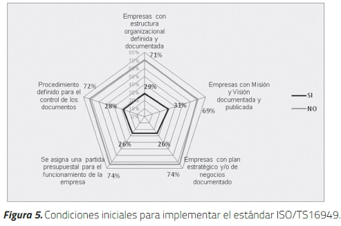 Las empresas que desarrollan planificación de la calidad y cuentan con las condiciones iniciales para implementar el estándar ISO/TS 16949 (Figura 5) corresponden a empresas con SGC. Éstas son empresas que tienen una estructura organizacional definida, misión y visión documentada y publicada, desarrollan plan estratégico de negocios, asignan presupuesto para el funcionamiento de la empresa y cuentan con procesos documentados. El estudio permitió observar que las empresas con ISO/TS 16949 o sistemas integrados de gestión como ISO9001 e ISO/TS 16949 interiorizan más los procesos de planificación hacia la calidad que aquellos que cuentan con solo el estándar ISO9001. En promedio 28 % de las empresas cuentan con planificación estructurada del SGC. Esto debido a que el estándar ISO/ TS 16949 se vuelve más expedito en la planificación de la calidad del producto (APQP) como un método estructurado para definir y establecer medidas necesarias para asegurar que un producto satisface al cliente. El objetivo del APQP en el proceso de planificación es facilitar la comunicación con todos los involucrados para asegurar que todos los pasos necesarios se hayan completado en el tiempo [18].