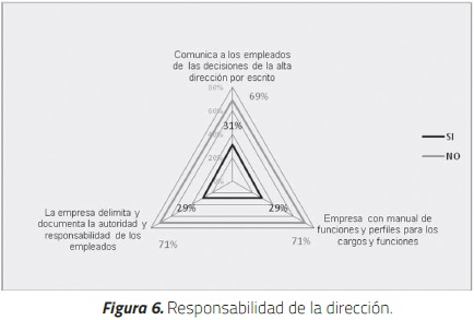 En cuanto a la responsabilidad de la dirección (Figura 6), 30 % de las empresas comunican a sus empleados las decisiones de la alta dirección, cuentan con manuales de funciones y perfiles para cargos, tienen delimitada y documentada la autoridad como la responsabilidad de los empleados. Un 70 % de las empresas no desarrollan la responsabilidad de la dirección con estos elementos.