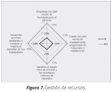 Para el factor gestión de recursos (Figura 7), el 24 % de las empresas desarrollan plan de formación del personal, elaboran plan escrito de mantenimiento, identifican los equipos claves del proceso y desarrollan acciones tendientes a la mejora del bienestar de los empleados.