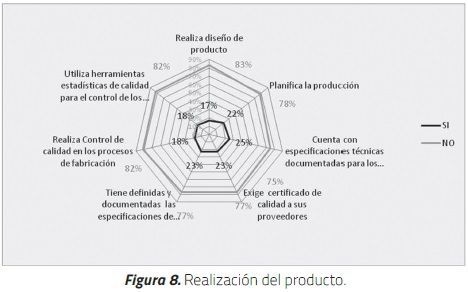 En el sector autopartista la realización del producto está condicionada al cumplimiento de las especificaciones de diseño, ya que el grado en que las empresas desarrollan diseño de producto es limitado. Sólo un 17 % realiza este proceso (Figura 8), mientras que las demás empresas se sujetan a las especificaciones del cliente (casa matriz) quien elabora los diseños e ingeniería de producto. En promedio un 20 % de las empresas elaboran planificación de la producción, cuentan con especificaciones técnicas de los productos que elaboran, exigen certificación de calidad a sus proveedores y tienen definidas y documentadas las especificaciones de calidad de producto.