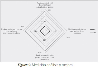 La medición, análisis y mejora (Figura 9) es uno de los condicionamientos clave en el desarrollo del producto. La ISO/TS 16949 exige determinación y uso de técnicas estadísticas apropiadas, así como el conocimiento de los conceptos estadísticos básicos por parte del personal que afecte la calidad. En cuanto a las auditorias, éstas deben ser realizadas al producto y al proceso de fabricación. De igual forma, las dimensiones y especificaciones técnicas del producto deben ser aseguradas a través de una completa medición. De las empresas observadas, el 20 % realiza procesos de medición, análisis y mejora. En su gran mayoría son empresas certificadas con el estándar ISO/TS 16949.