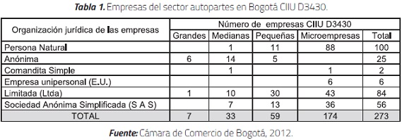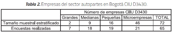 Para determinar el tamaño muestral de las empresas se identificaron 273 empresas que corresponden al código de actividad económica CIIU D3430 (Fabricantes de partes, piezas y accesorios (autopartes) para vehículos automotores y para sus motores). Se utilizó igualmente el sistema de base de datos a la medida de la Cámara de Comercio de Bogotá, el cual representa el tamaño poblacional del sector (Tabla 1):