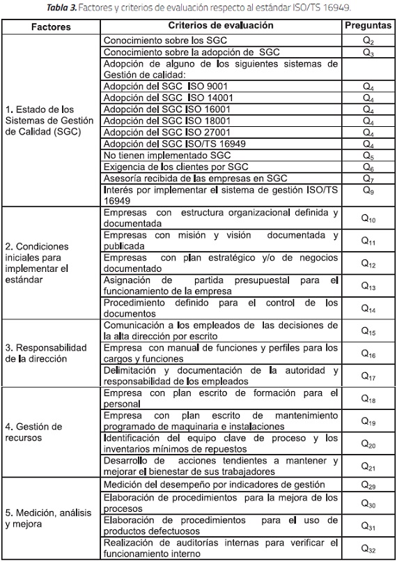 Se desarrolló un cuestionario estructurado sobre la revisión literaria en el área de la norma ISO/TS 16949. Tomando como referentes Lang et al. [14], se diseñaron los factores de medición en el cuestionario, dividido en tres partes principales: (1) datos de las empresas, (2) conocimiento de la norma, y (3) estado de implementación del estándar. Éstos a su vez se descomponen en 6 factores importantes: (1) condiciones iniciales para implementar el estándar, (2) responsabilidad y compromiso de la dirección, (3) gestión de los recursos, (4) la realización del producto, (5) medición, análisis y mejora, y (6) sistema de información de calidad. Con base en estos factores, se diseñaron 31 ítems para el cuestionario con un formato de respuestas directas tipo dicotómicas sí - no. Los factores a evaluar y los criterios de evaluación se presentan en la tabla 3.