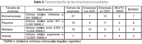 De las 65 empresas encuestadas, 10 (15 %) empresas contaban con el sistema de gestión de calidad ISO/TS 16949, 27 (42 %) empresas contaban con el estándar ISO 9001 y 32 (45 %) empresas no adoptaban sistemas de gestión de calidad. En este último caso, la calidad se centra en obtener un producto con los estándares de calidad exigidos por el cliente. En la tabla 5 se puede observar la caracterización de las empresas encuestadas. Por otra parte, ninguna de las empresas encuestadas respondieron el adoptar otros sistemas de gestión de calidad como la ISO14000 (norma aceptada internacionalmente que establece cómo implantar un sistema de gestión medioambiental (SGM)), ISO18001 (sistemas de gestión en seguridad y salud ocupacional), ISO27001 (sistemas de gestión de la seguridad de la información (SGSI)).