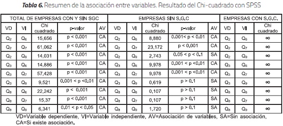 Se define la exigencia que realizan los clientes en la adopción de SGC (Q6) como factor influyente para que las empresas se interesen en adoptarlos (Q3). Dado que el valor calculado de la χ2 es 14 886 (todas las empresas) y χ2 de 9978 (empresas sin SGC). La asesoría que reciben las empresas (Q7) influye en que éstas adopten los SGC (Q9).
