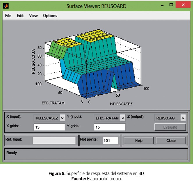 Finalmente, las reglas del sistema se adquirieron a través de encuestas dirigidas a expertos en temas como: reutilización de aguas residuales, tratamiento de aguas residuales, microbiología de suelos y fisiología vegetal. Las encuestas lograron identificar las opiniones de los expertos frente a diferentes escenarios. Luego las encuestas fueron sistematizadas y ponderadas para realizar un consenso en la variable de respuesta.