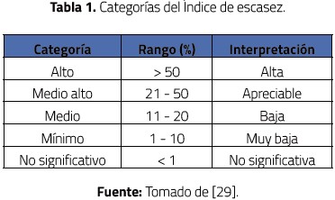 Índice de escasez: para el cálculo de dicha variable se tendrá en cuenta la oferta y demanda hídrica de la zona de estudio, según la Resolución 0865 del 22 de julio de 2004, por la cual se adopta la metodología para el cálculo del Índice de escasez para aguas superficiales (Tabla 1), desarrollada por el Instituto de Hidrología, Meteorología y Estudios Ambientales (Ideam), definiéndose este como la relación porcentual entre la demanda de agua del conjunto de actividades sociales y económicas con la oferta hídrica disponible, luego de aplicar factores de reducción por calidad del agua y caudal ecológico.