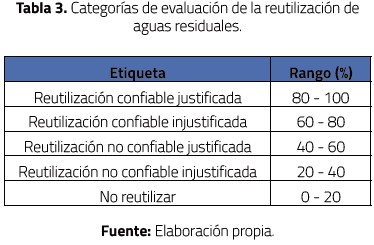 Reutilización del agua residual: esta es la variable de salida del sistema, representa el potencial de reutilización de agua residual en términos porcentuales (Tabla 3). Las posibles respuestas son las etiquetas de la variable, las cuales tienen en cuenta las variables de entrada y las reglas basadas en conocimiento experto.