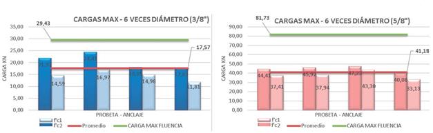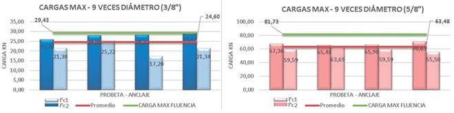 Al realizar la comparación entre el grupo de resultados de las cargas a tracción de la resistencia de concreto f'c2 y f'c1, se observa que en las curvas del concreto de mayor resistencia se desarrollan unas mayores cargas máximas del sistema de anclaje. Aun cuando la falla sea por el concreto o por el acero en el sistema de anclaje, en los dos casos el acero de refuerzo ya había alcanzado la resistencia máxima de fluencia fy=4200k/ cm2. También se puede afirmar que en cualquiera de los dos casos se garantizaría que el sistema de anclaje siempre cumpla con los requisitos de resistencia.