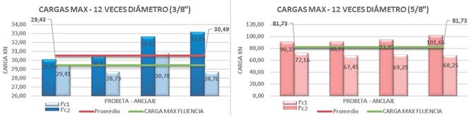 De los resultados de las cargas máximas de los sistemas de anclaje, se observó que en los sistemas de anclaje con doce veces el diámetro de la varilla se garantiza que se desarrolle la carga máxima de fluencia del acero de refuerzo.