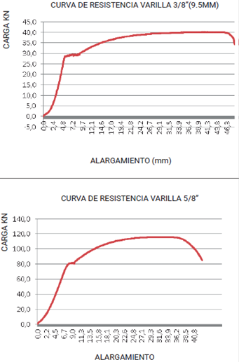 Para las dos resistencias de concreto se fallaron las probetas con las tres profundidades para evaluar la longitud efectiva de anclaje con barras de refuerzo de 3/8" (9,5mm) y 5/8" (15,9mm). Como base para correlacionar los resultados de los sistemas de anclaje posinstalado, se realizaron las pruebas a tracción del acero de refuerzo utilizado 25. En la Fig. 3 se muestran los resultados de la curva de resistencia a tracción del refuerzo 3/8" (9,5mm) a la izquierda y a la derecha, la curva de resistencia a tracción 5/8" (15,9mm).