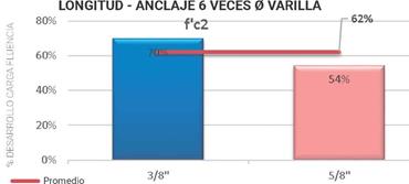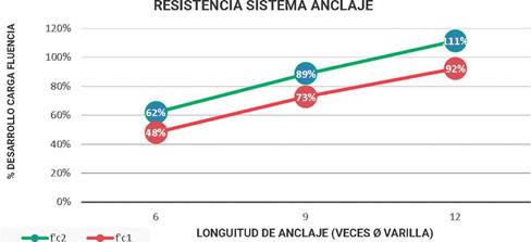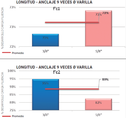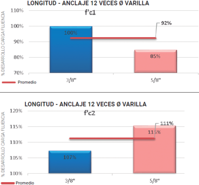 Por lo anterior, se determina que con una longitud de anclaje de 12 veces el diámetro de la varilla se cumple de forma "aceptable" con la resistencia máxima de fluencia del acero de refuerzo. Para la resistencia de concreto f'c2, tomando una longitud de anclaje de 6 veces el diámetro de la varilla, se desarrolla en promedio el 62 % de la carga máxima a fluencia del acero de refuerzo. Para una longitud de anclaje de 9 veces el diámetro de la varilla se desarrolla en promedio el 89 % de la carga máxima a fluencia del acero de refuerzo; finalmente, para la longitud de anclaje de 12 veces el diámetro de la varilla, se desarrolla en promedio el 111 % de la carga máxima a fluencia del acero de refuerzo. En vista de lo mencionado, se comprueba que con una longitud de anclaje de 12 veces el diámetro de la varilla, se cumple ampliamente con la resistencia máxima de fluencia del acero de refuerzo.