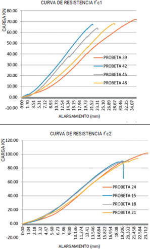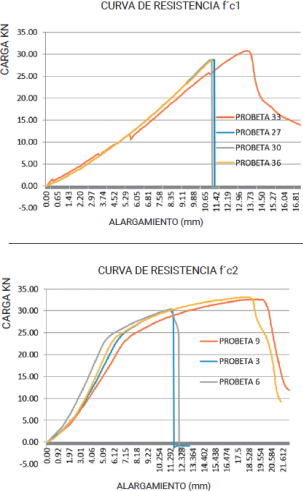 Teniendo en cuenta la proyección de los resultados de los ensayos a 7 días, se logró predecir la resistencia a los 28 días de cada una de las resistencias de trabajo. Como resultado, la resistencia f'c1 fue de 34,38MPa (5000Psi) y la resistencia f'c2 de 42,11MPa (6000Psi).