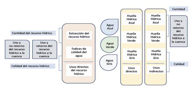 La huella hídrica (HH) es un indicador del uso de agua dulce que contempla su uso directo e indirecto por parte de un consumidor o productor. La referencia a ella tiene sus inicios en el año 2002, gracias al profesor Arjen Hoekstra. En el contexto regional, se identificaron estudios como: "Evaluación de la huella de carbono y huella hídrica, ciudad de Santiago de Cali", mientras que desde una perspectiva nacional se encuentran investigaciones como: "Evaluación multisectorial de la huella hídrica en Colombia. Resultados por subzonas hidrográficas en el marco del Estudio Nacional del Agua 2014", y el "Estudio nacional del agua 2018". Las investigaciones previamente mencionadas suministran la información para determinar y analizar la HH, así como también la calidad y la disponibilidad del agua superficial y subterránea en el contexto colombiano [1].