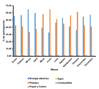 De acuerdo con la tabla 2 yla figura 5, se observa que los aspectos ambientales que presentaron mayor participación en el cálculo del indicador para todos los meses de estudio fueron los consumos de energía eléctrica y el plástico, con participaciones mínimas del 32 % y 33 %, respectivamente, lo que en conjunto representa más del 95 % de la participación en el consumo de agua indirecta para la producción de envases de plástico. Lo anterior contrasta en la participación de este indicador para el consumo de agua (consumo directo), cuyo valor no supera el 2 % de la cuantificación global de la HH durante todo el periodo del estudio. Este patrón es semejante para el consumo de papel, cartón y combustibles (consumo indirecto).