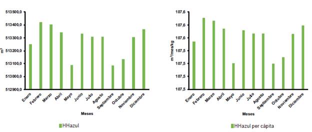 La HHazul se determinó cada mes mediante las ecuaciones 1 y 2, teniendo en cuenta el agua virtual que demandaban los procesos para la producción.
