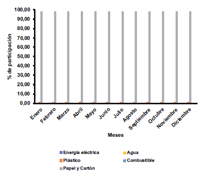 De acuerdo con la tabla 3 yla figura 7, se observa que el aspecto ambiental que presentó mayor participación en el cálculo del indicador para todos los meses de estudio correspondió al consumo de papel y cartón, con una representación por encima del 95 %, lo que indica que casi la totalidad de la contribución en el consumo de agua ocurre de forma indirecta en el proceso de producción de espumas fenólicas. Lo anterior contrasta con el porcentaje del cálculo de este indicador para el consumo de agua (consumo directo), cuyo valor no supera el 1 % de la totalidad en la huella hídrica durante todo el periodo del estudio, comportamiento que también ocurre con el consumo de energía, plástico y combustibles (consumo indirecto). Aunque la espuma fenólica tiene un impacto ambiental significativo, superior al de otros materiales, para su producción se utilizan insumos derivados de petróleo y gas natural [27], evidenciando que, conforme a las prácticas operacionales, su impacto se extiende no solo a este tipo de combustibles.