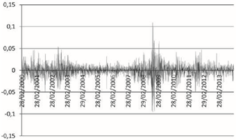 Los Gráficos 4, 5 y 6 exponen la evolución de los rendimientos que, por jornada diaria de cotización, se han registrado para cada uno de los índices del mercado desde el 25 de febrero de 2000 hasta el 17 de febrero de 2014. Uno de los aspectos que caracteriza las series de tiempo analizadas consiste en su permanente volatilidad, especialmente entre 2001-2003 y 2008-2009.