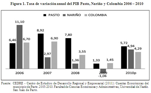 Con el análisis de las cuentas económicas del municipio de Pasto (CEDRE, 2011), se detecta que la dinámica de la economía de este municipio se ha caracterizado por ser cíclica y además volátil. Dicha volatilidad estaría advirtiendo que la economía del municipio es muy sensible a choques o perturbaciones, derivadas de las políticas económicas nacionales y regionales, y aún de las externas, dado el carácter de frontera que tiene el departamento de Nariño, del cual Pasto es su capital. No es menos importante la sensibilidad de la economía municipal a perturbaciones derivadas de fenómenos sociales presentes en Nariño, como el conflicto armado y el narcotráfico, con sus secuelas de violencia y desplazamiento forzado, cuya necesaria atención causa una presión, fundamentalmente, sobre los recursos públicos, que puede propiciar un menor dinamismo de la economía local; elementos coyunturales como el conocido caso de las pirámides o el de la amenaza volcánica, sin duda son factores que en su momento perturbaron fuertemente el comportamiento económico de la ciudad de Pasto. (ORMET, 2012).