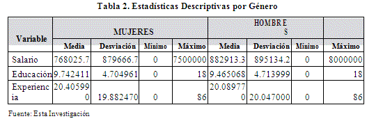Los datos indican una alta variabilidad sobre todo en el salario, la educación y los años de experiencia, evidenciando heterogeneidad de los mismos. El promedio general de ingresos es de $826.458,7 con una desviación de $889.152,5, tomando valores entre $0 y $8.000.000. El promedio de educación en la población es de 9,6 años con una desviación de 4,7 años, tomando valores entre 0 y 18 años de educación. Asimismo, la experiencia laboral registra un promedio de 20,3 años con una desviación de 20 años, tomando valores entre 0 y 86 años.