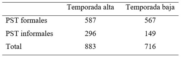 En la Tabla 1 se ilustran los datos asociados al estudio efectuado por el Sistema de Indicadores Turísticos de Medellín (SITUR), realizado mediante verificación presencial, con base en características del PST, como vigencia del nombre, dirección, estado del RNT, entre otros (SITUR, 2018a: 8-9). Como se puede observar, para la temporada alta del año 2018, el 66% de los establecimientos que prestaban servicio de alojamiento en Medellín, pertenecían al sector formal y el 34% al informal. En la temporada baja estos porcentajes se ubicaron en el 79% y 21%, respectivamente (SITUR, 2018b: 9-10).