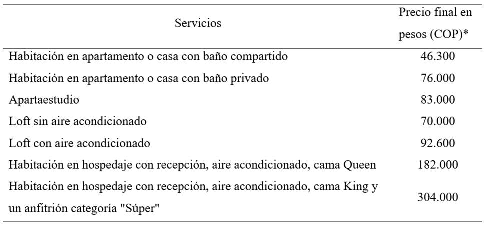 Tabla 2: Tarifas de acuerdo con los servicios en Airbnb