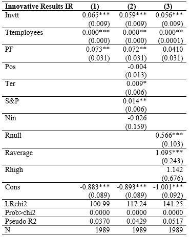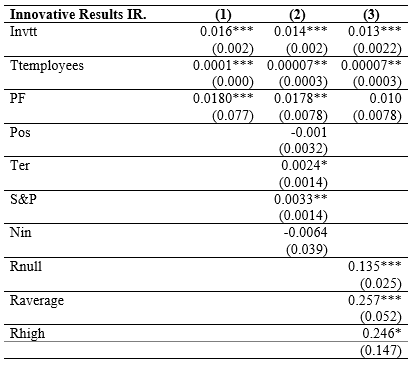 The analysis results show that public funding affects, although low, statistically significant on companies' innovative results. Therefore, it can be affirmed that the greater the public resources allocated to companies to invest in technology, science, and innovation, the greater are the probability that they will achieve innovative results; this aspect has also been verified by the researches of Wong & He (2001), Zhang & Liu (2010), Hanel (2003), Albors-Garrigos & Rodríguez (2011) , although they are carried out in other countries, they indicate the influence of public resources in R&D on innovative results.