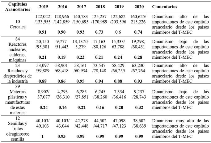La dinámica importadora del departamento está liderada por las partidas arancelarias de productos agrícolas. La más importante es la 1005901100correspondiente a maíz duro amarillo con una participación total del 35% de las transacciones comerciales desde el mercado del T-MEC. Le siguen en importancia las partidas 1001991090 (los demás trigos) con una participación del 22%; la partida 2304000000 (Tortas y demás residuos sólidos de aceite de soja) con una participación del 20%; la partida 1201900000 (las demás habas, porotos, frijoles de soja) con participación del 15% y finalmente la partida 1005901200 Maíz duro blanco con 2,6%. Estas cifras reflejan una alta dependencia de las importaciones santandereanas de productos de origen agrícola con un total del 92% de las compras internacionales del departamento.